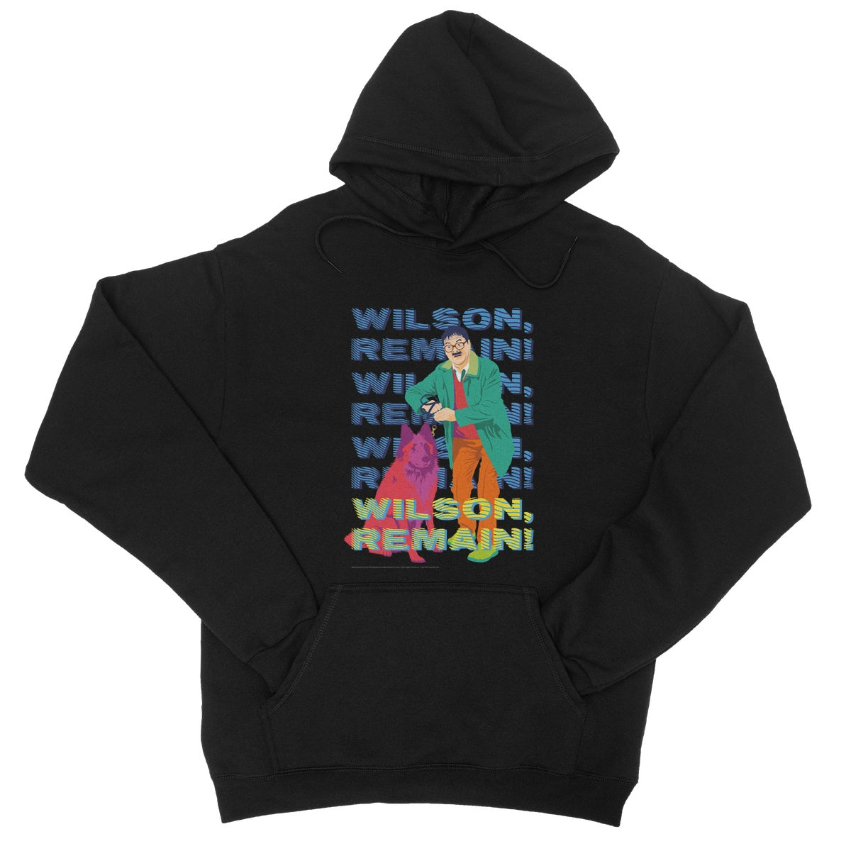 this adults college hoodie features Jim and his classic line from the from the show from when ever he addresses his dog "Wilson remain" . This hoodie is not only comfortable but also looks great with its colourful neon design.